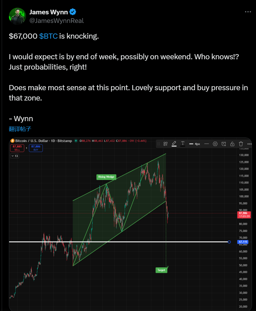 深潮 TechFLOW 消息,11 月 25 日,交易員 James Wynn(@JamesWynnReal)在社交媒體發文表示,BTC 正在接近 67,000 美元價位,預計該價位可能在本週末前到來。