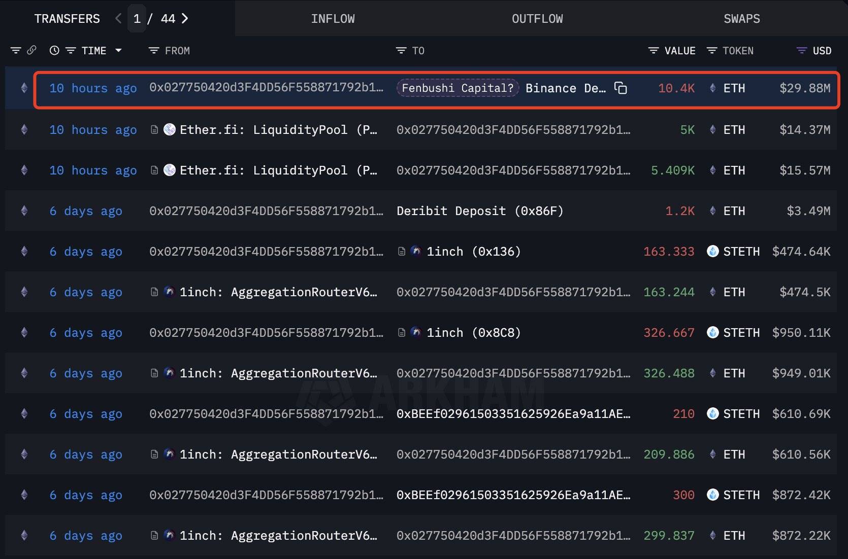 深潮 TechFlow 消息,11 月 26 日,據 Lookonchain 監測,一個疑似與分佈式資本(Fenbushi Capital)相關的錢包在 10 小時前向幣安充值 10,400 枚 ETH,價值約 2,988 萬美元。