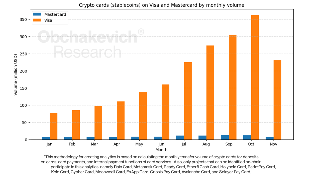 深潮 TechFlow 消息,11 月 26 日,據分析師 Alex 披露,Visa 在加密貨幣卡發行領域佔據主導地位,月交易量達 3.65 億美元。
