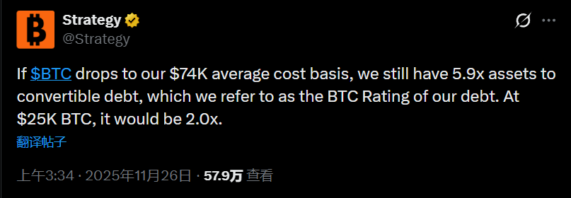 深潮 TechFlow 消息,11 月 26 日,Strategy 今日凌晨在社交媒體平台發文稱:“若比特幣價格跌至我們7.4萬美元的平均成本價,我們仍擁有相當於可轉換債務5.9倍的資產,我們將此稱為債務的比特幣評級。若比特幣價格跌至2.5萬美元,該比率則為2.0倍。”