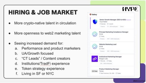 行業成熟化,後期公司和 Web2 公司更傾向於招聘專業細分的加密營銷人才,而非「什麼都做」的通才型營銷負責人。
