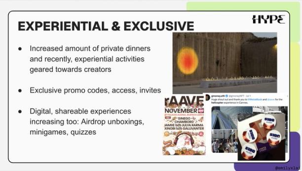 門票獲取方式趨向層級化、獨家化和序列化營銷激活。 數字化體驗也在增加:空投開箱、迷你游戲、Buzzfeed 式可分享性格測試等。 更多靈感源自 Web2 品牌活動、快閃概念和網紅活動,並被引入加密領域。