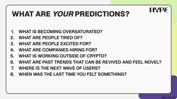 保持領先的關鍵在於:把握領域脈搏、從加密圈外汲取靈感、並堅持第一性原理思考。 以下問題有助於形成你自己的預測和營銷策略: