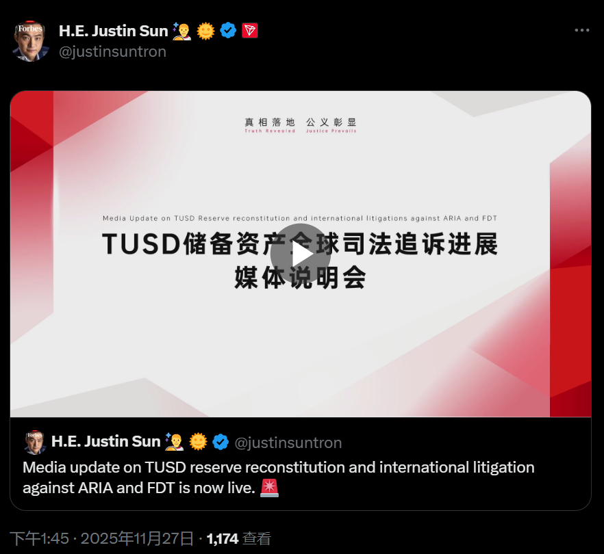 孫宇晨在 X 上開啟“TUSD儲備資產全球司法追訴進展媒體說明會”直播