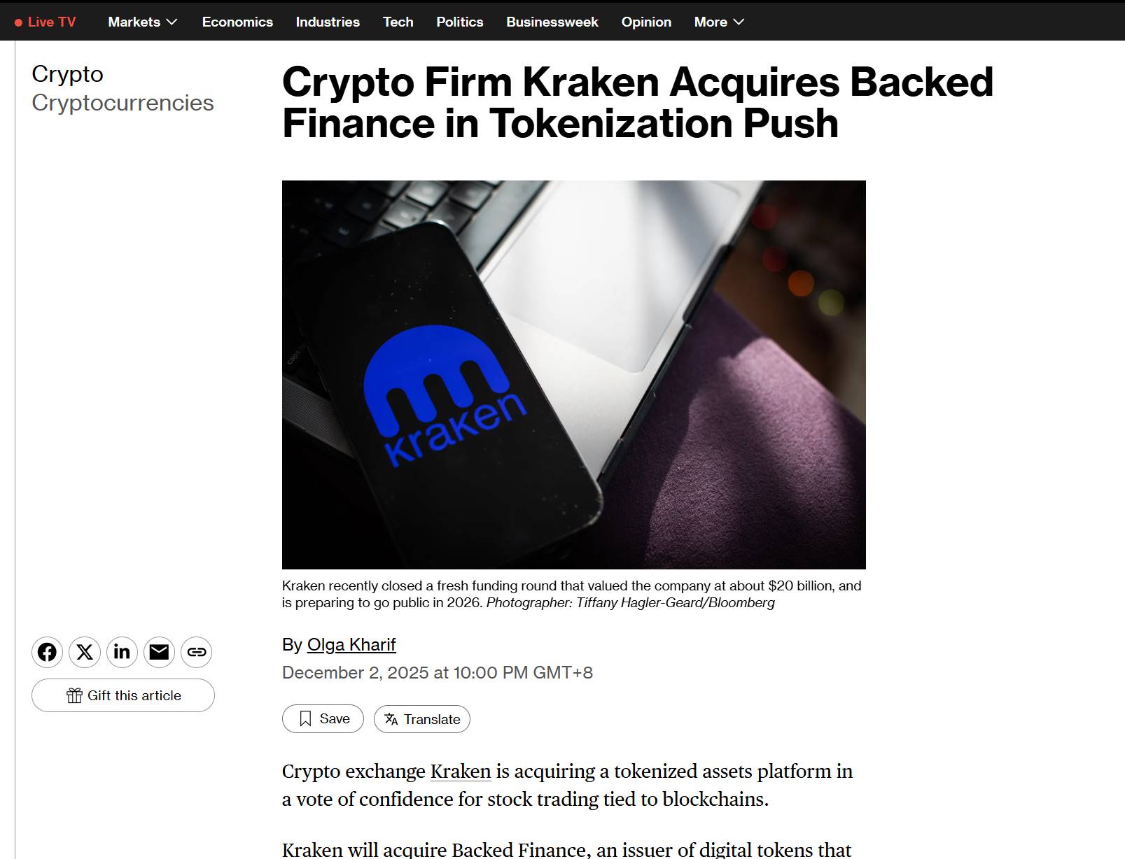深潮 TechFlow 消息,12 月 2 日,據彭博社報導,加密貨幣交易所 Kraken 宣布收購代幣化資產平台 Backed Finance。