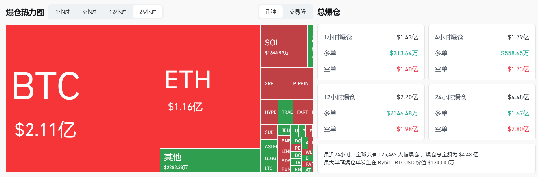 過去 24 小時全網爆倉 4.48 億美元,主爆空單