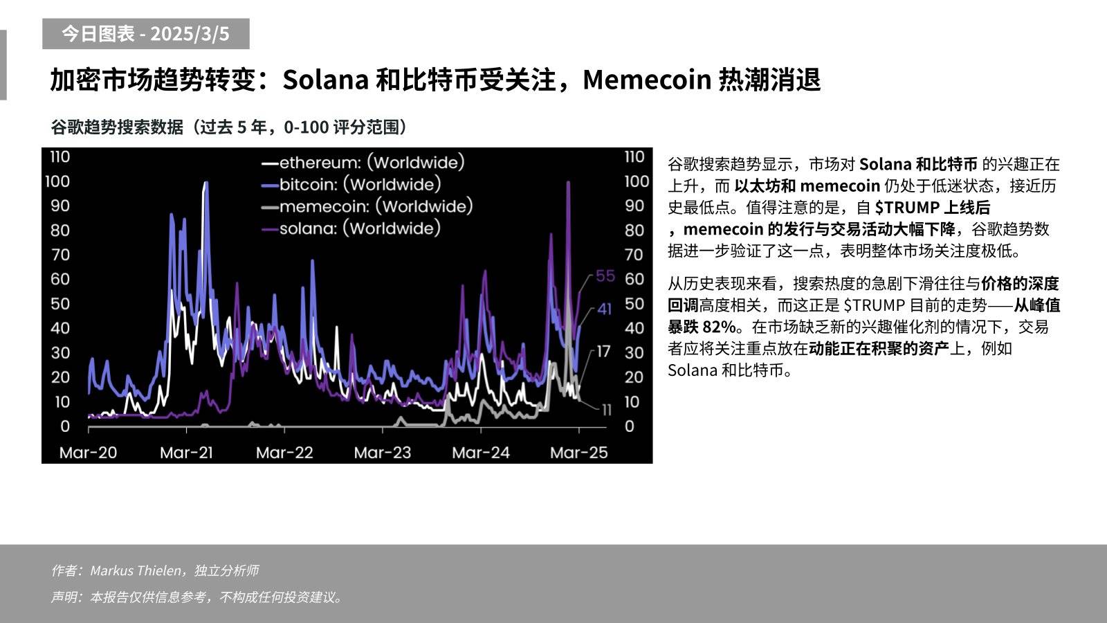 TRUMP 上線後,Memecoin 相關活動大幅下降,谷歌趨勢數據顯示其整體市場關注度極低。 搜索熱度急劇下滑往往與價格深度回調高度相關,這與 TRUMP 從峰值暴跌 82% 的走勢一致。 建議交易者應將注意力轉向動能正在積聚的資產,如 Solana 和比特幣。