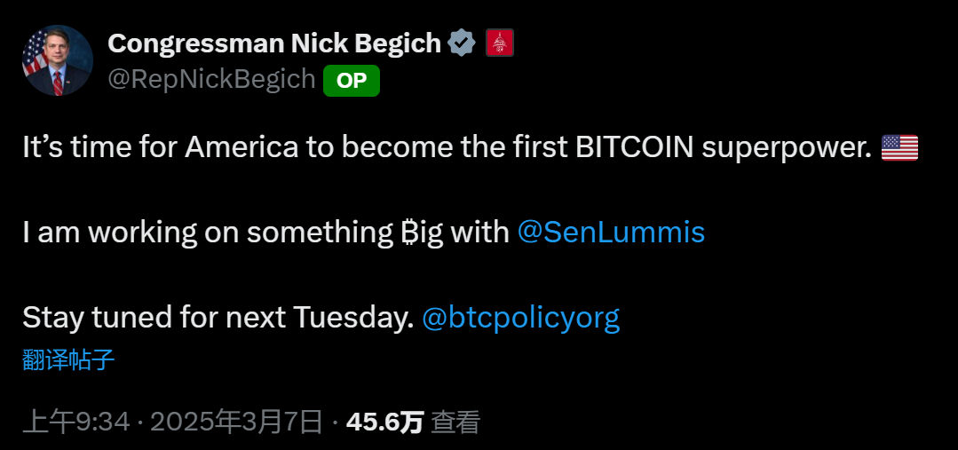 深潮 TechFlow 消息,3 月 7 日,美國眾議員尼克·貝吉奇(Nick Begich)發布推文稱:“是時候讓美國成為第一個比特幣超級大國了。”