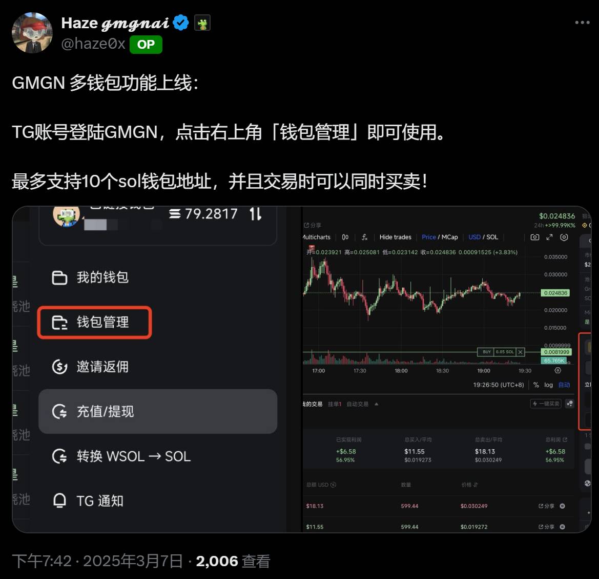 深潮 TechFlow 消息,3 月 7 日,GMGN 聯合創始人 Haze 在社交媒體發布更新,GMGN 已正式上線多錢包功能。 用戶通過 Telegram 賬號登錄 GMGN 後,點擊界面右上角的“錢包管理”以啟用該功能。