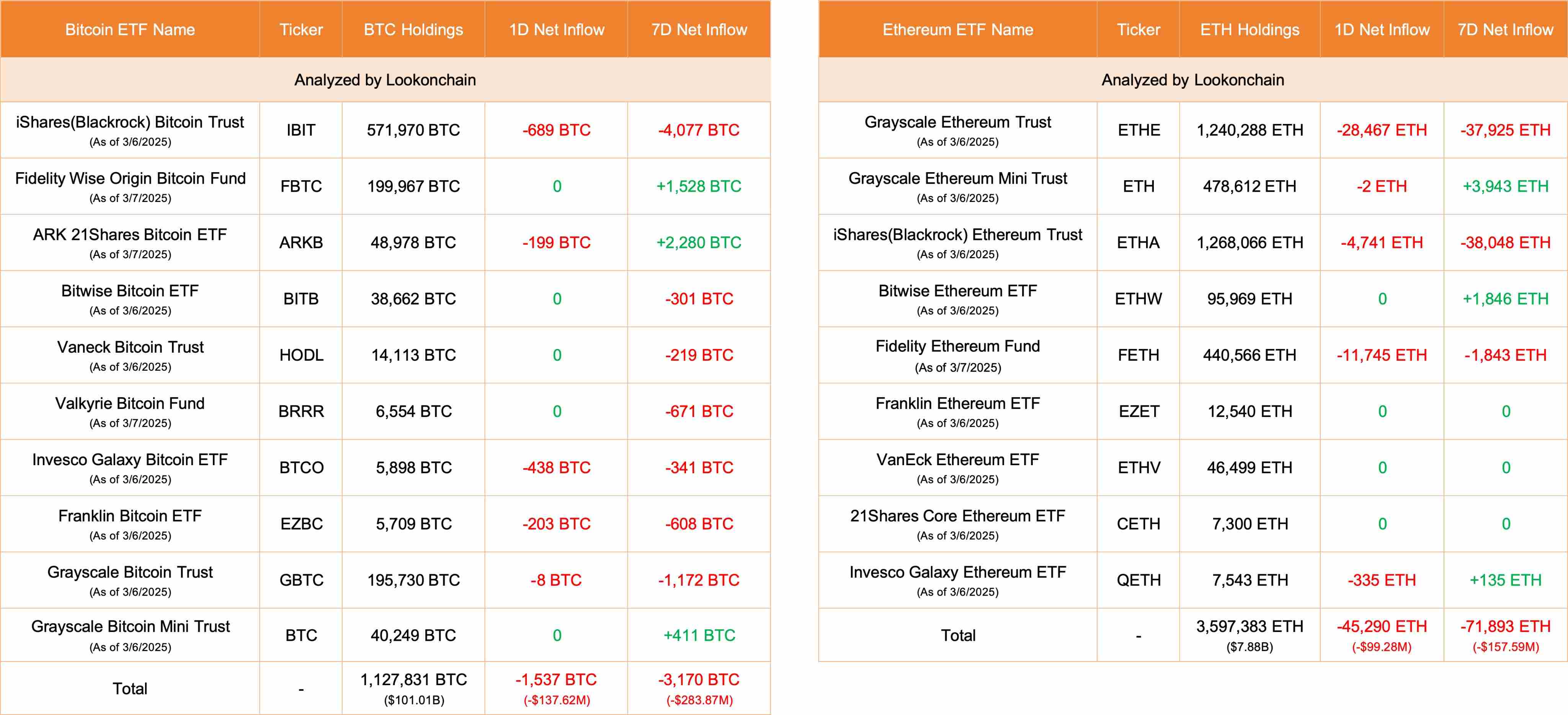 深潮 TechFlow 消息,3 月 7 日,據 Lookonchain 監測,今日 10 只比特幣 ETF 淨流出 1,537 枚比特幣,價值約 1.38 億美元。 其中,貝萊德旗下 iShares 比特幣 ETF 流出 689 枚比特幣(約 6,170 萬美元)。