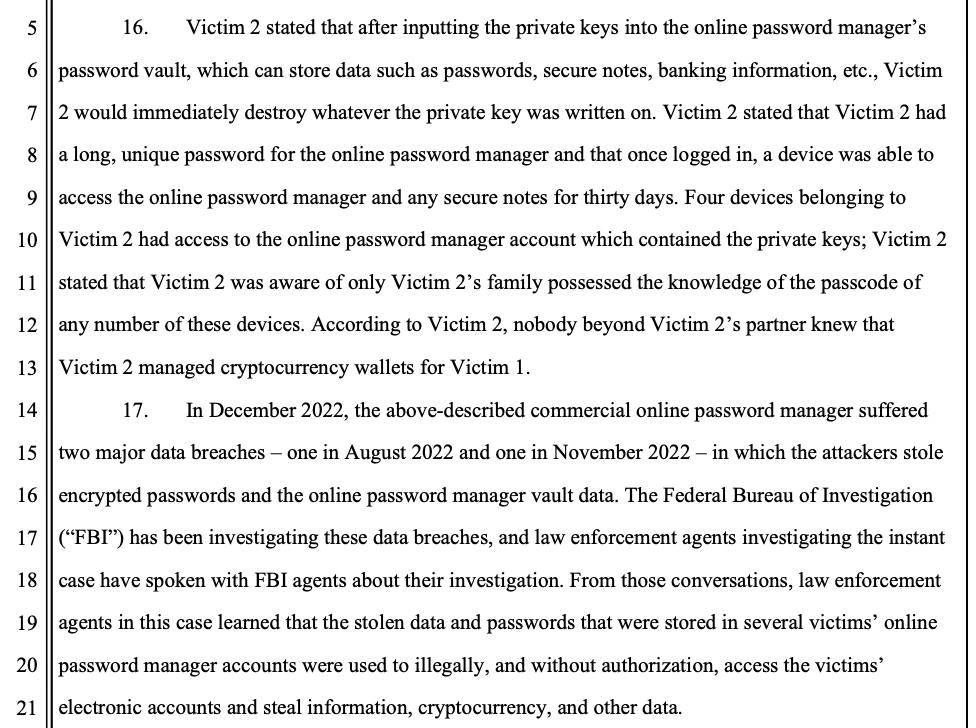文件顯示,受害者將加密貨幣錢包私鑰輸入在線密碼管理器後,會立即銷毀私鑰的物理記錄。 該密碼管理器在 2022 年 8 月和 11 月遭遇兩次重大數據洩露,攻擊者竊取了加密密碼和保險庫數據。 FBI 調查發現,這些被盜數據被用於非法訪問多名受害者的電子賬戶,並竊取信息、加密貨幣和其他數據。