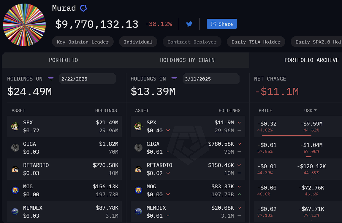 深潮 TechFlow 消息,3 月 11 日,據 Arkham 監測,知名 meme 幣 KOL Murad 的加密資產組合在過去半個月內大幅縮水。 從 2 月 22 日至 3 月 11 日,其持倉總價值從 2449 萬美元下跌至 1339 萬美元,淨虧損達 1110 萬美元,跌幅約 45%。