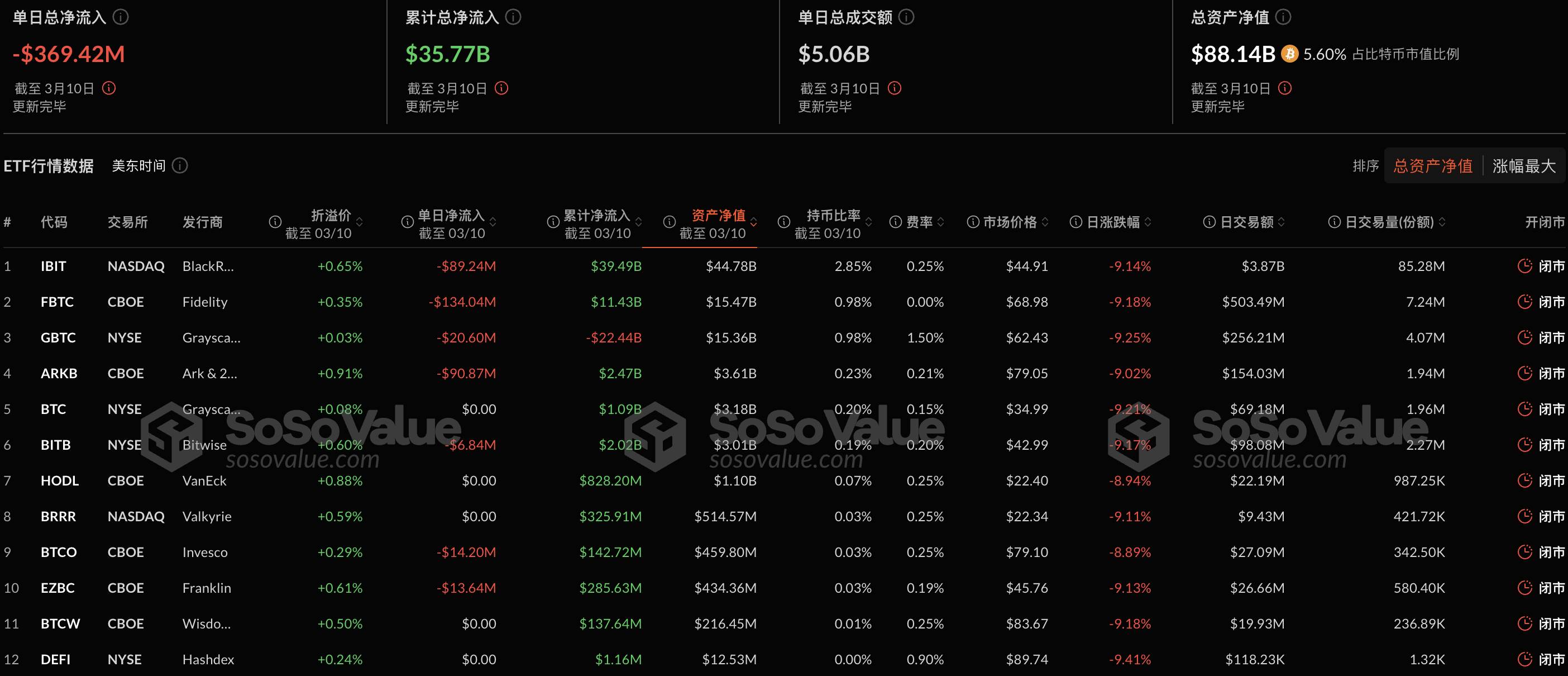 深潮 TechFlow 消息,3 月 11 日,根據 SoSoValue 數據,昨日(美東時間 3 月 10 日)比特幣現貨 ETF 總淨流出 3.69 億美元。