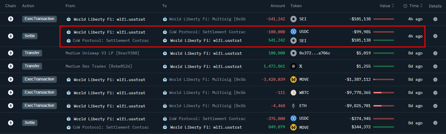 特朗普家族加密項目 WLFI 於 4 小時前增持 10 萬美元 SEI 代幣