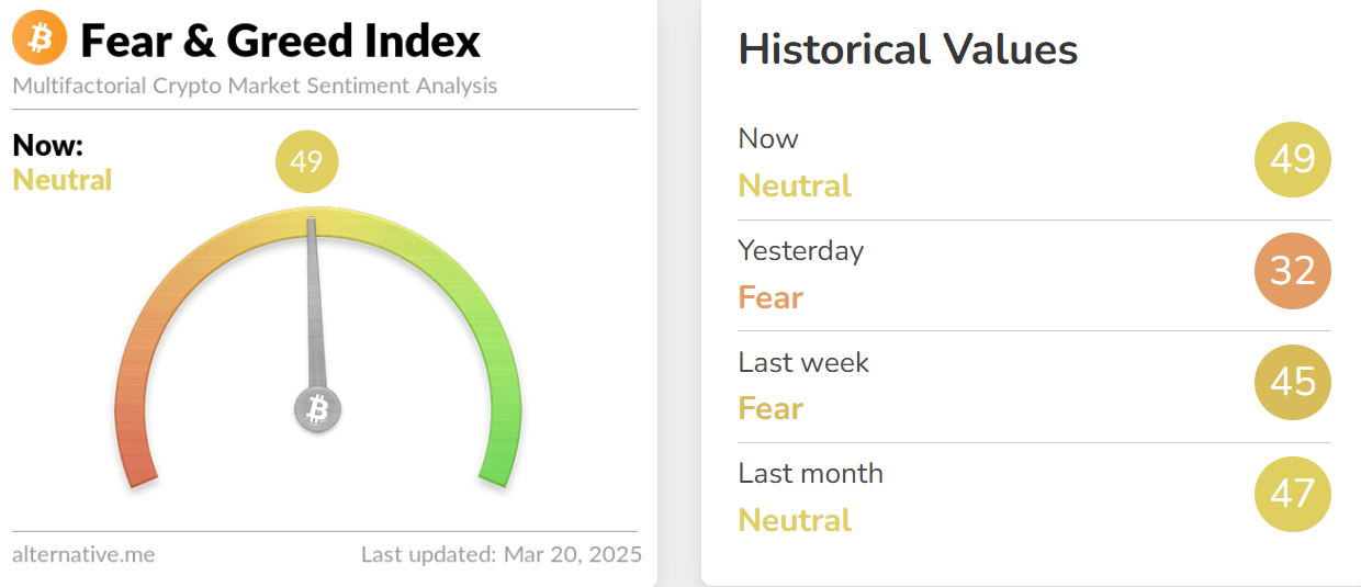 深潮 TechFlow 消息,3 月 20 日,據 Alternative.me 數據,今日加密貨幣恐慌與貪婪指數為 49(昨日該指數為 32),表明市場已從「恐慌狀態」轉為「中性狀態」。