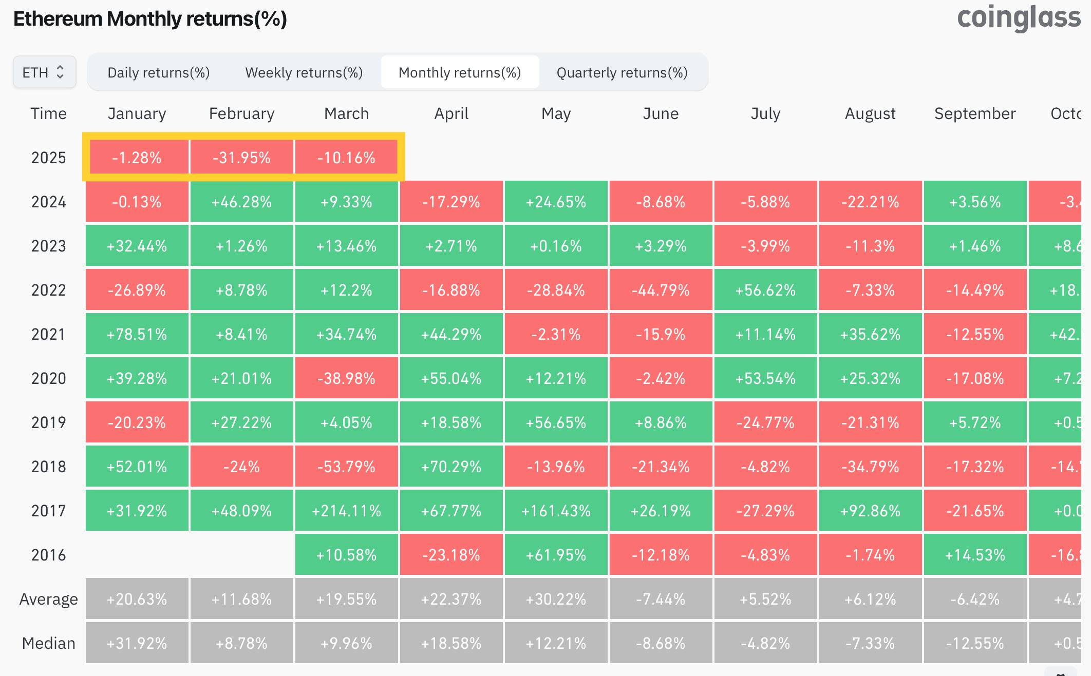 深潮 TechFlow 消息,3 月 24 日,據 Coinglass 數據,以太坊在 2025 年第一季度經歷了近年來最為慘淡的開局,連續三個月均呈現負收益: