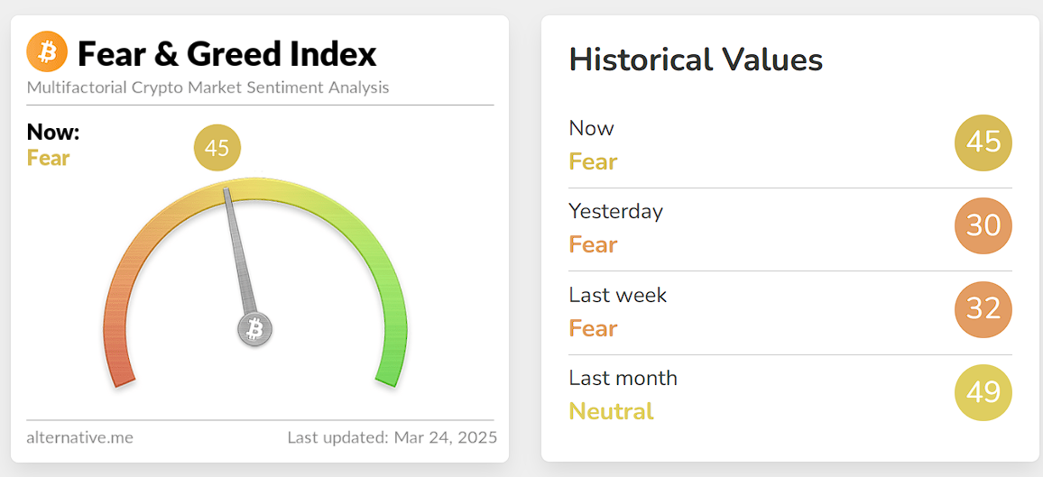 今日加密貨幣恐慌與貪婪指數升至 45,市場恐慌情緒大幅緩解
