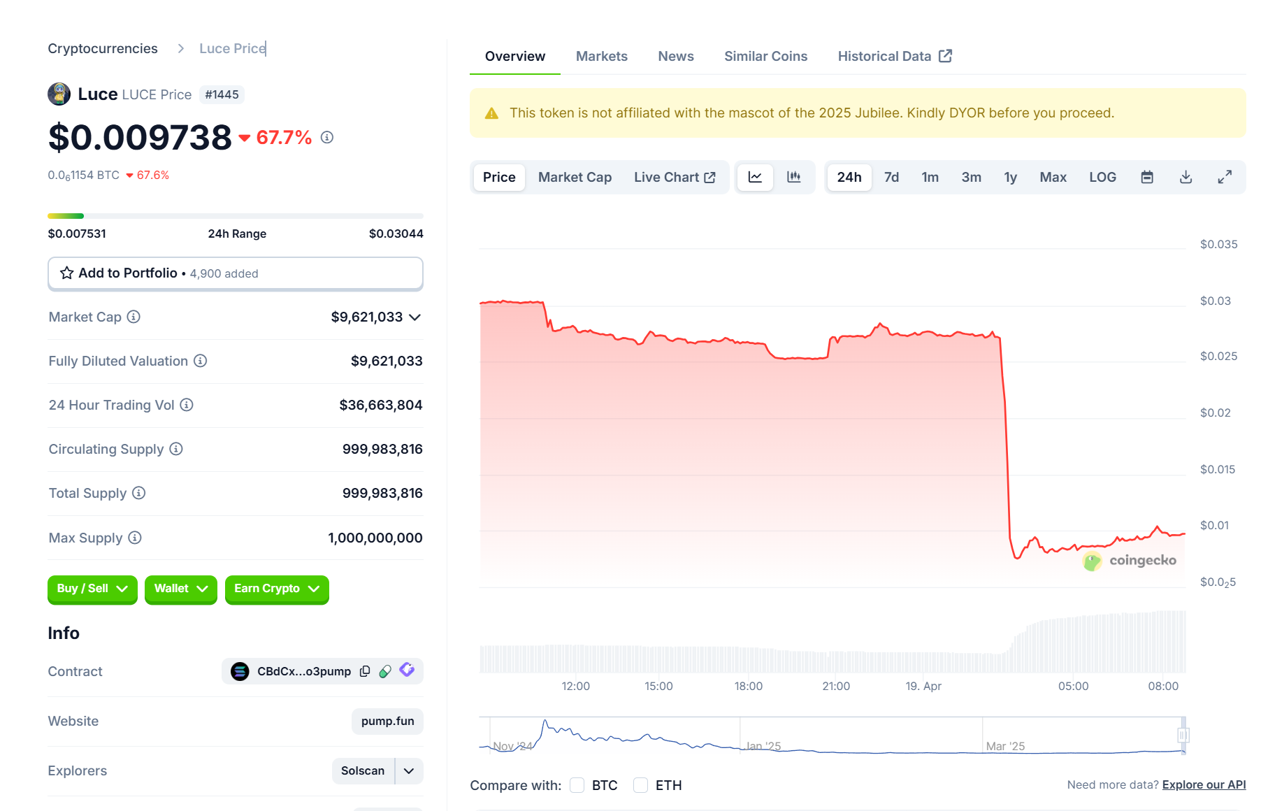 今日凌晨 LUCE 急速下跌約 70%,市值現約 960 萬美元