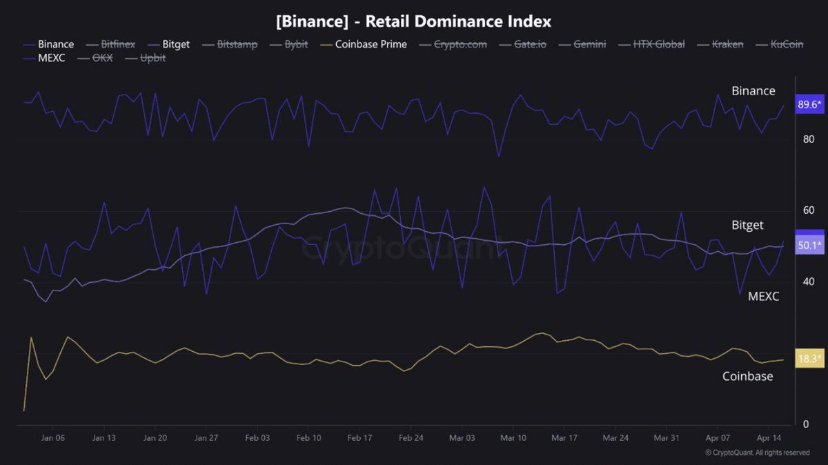 深潮 TechFlow 消息,4 月 20 日,據 CryptoQuant 最新報告數據顯示,Binance 個人投資者主導指數達 89.6%,相比之下,Coinbase 個人投資者主導指數僅為 18.3%。 Bitget 個人投資者主導指數為 50.1%,位居第二。