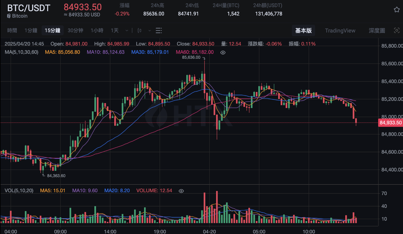 深潮 TechFlow 消息,4 月 20 日,據 HTX 行情數據顯示,BTC 跌破 85000 美元,現報 84933.5 美元,24 小時跌幅 0.29%。