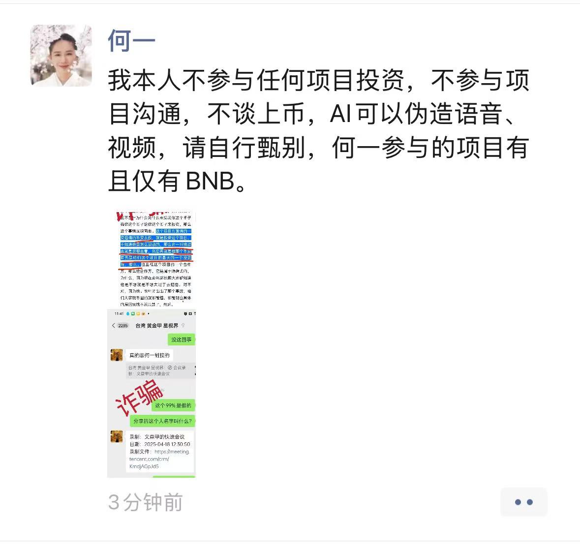 深潮 TechFlow 消息,4 月 20 日,幣安聯合創始人何一在社交平台發文表示:“我本人不參與任何項目投資,不參與項目溝通,不談上幣,AI 可以偽造語音、視頻,請自行甄別,何一參與的項目有且僅有bnb。”
