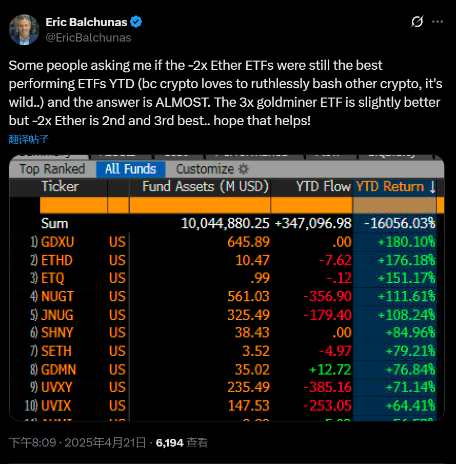 深潮 TechFlow 消息,4 月 21 日,彭博社高級 ETF 分析師 Eric Balchunas 在 X 平台發文表示,2 倍反向以太坊 ETF 幾乎是今年迄今表現最好的交易所交易基金,表現僅次於 3 倍黃金礦工 ETF。
