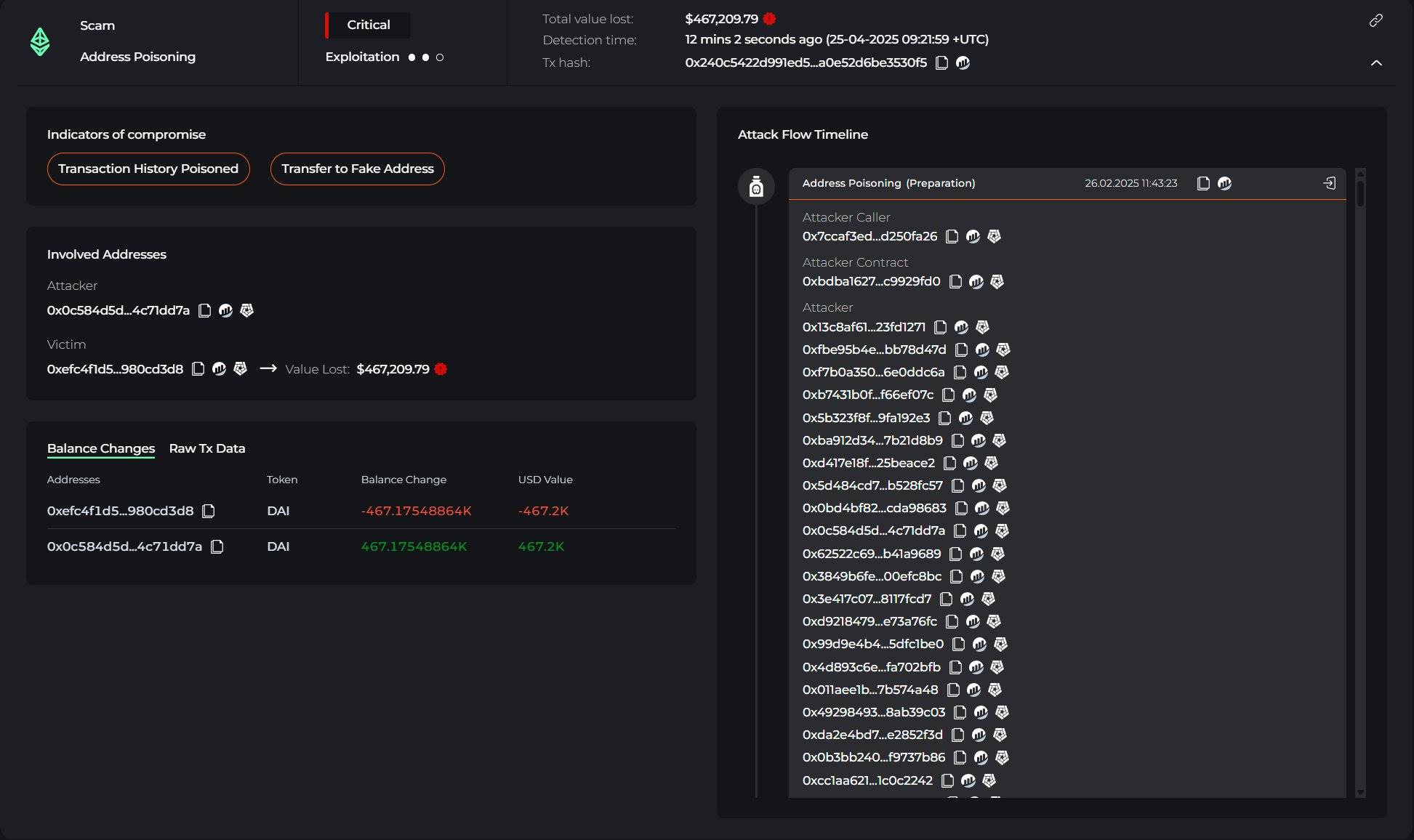 深潮 TechFlow 消息,4 月 25 日,據 Cyvers Alerts(@CyversAlerts)監測,某用戶遭“交易歷史投毒攻擊”,受害者在轉賬過程中誤將資金發送至詐騙者地址,損失約 46.7 萬枚 DAI 。