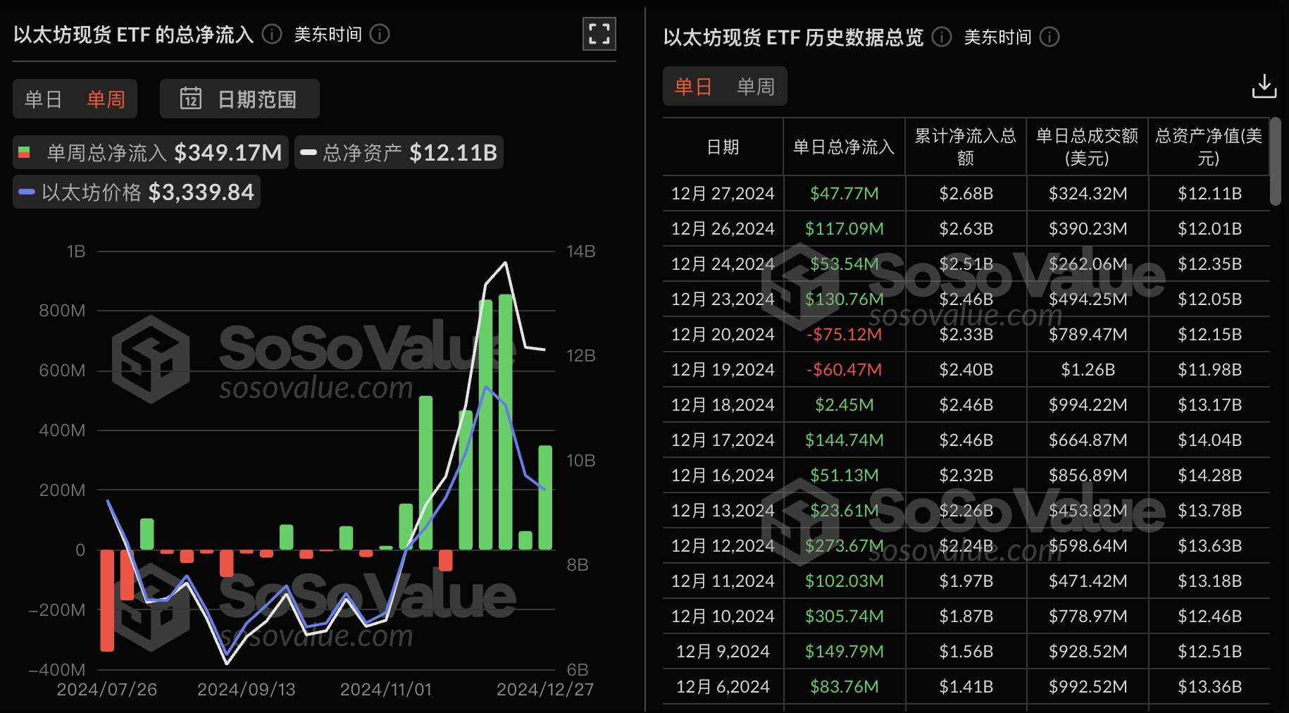 深潮 TechFlow 消息,根據 SoSoValue 數據,上週交易日(美國東部時間 12 月 23 日至 12 月 27 日)以太坊現貨 ETF 上週單週淨流入 3.49 億美金。