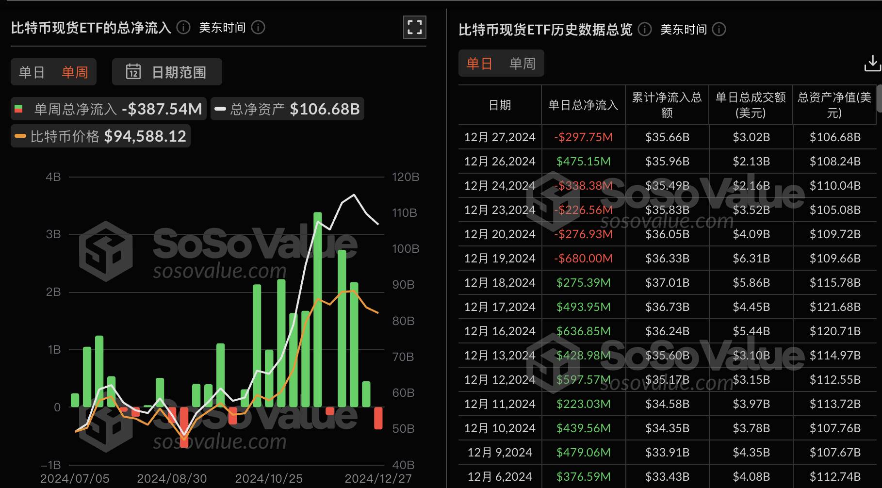 深潮 TechFlow 消息,根據 SoSoValue 數據,上週交易日(美國東部時間 12 月 23 日至 12 月 27 日)比特幣現貨 ETF 上週單週淨流出 3.88 億美金。