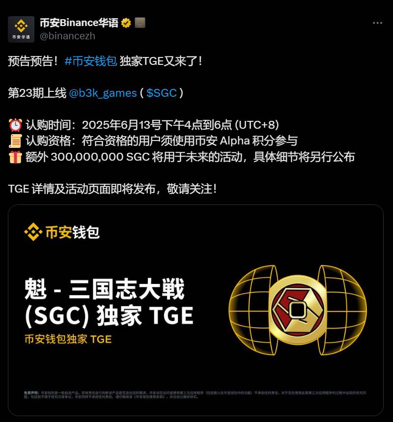 深潮 TechFlow 消息,6 月 12 日,據官方公告,幣安錢包將於2025年6月13號下午4點到6點 (UTC+8)上線 SGC 獨家 TGE。