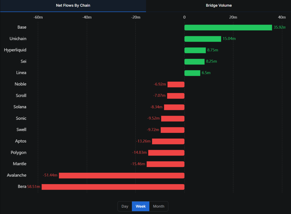 數據:Base、Unichain 和 Hyperliquid 位列過去一周跨鏈橋資金流動榜單前三