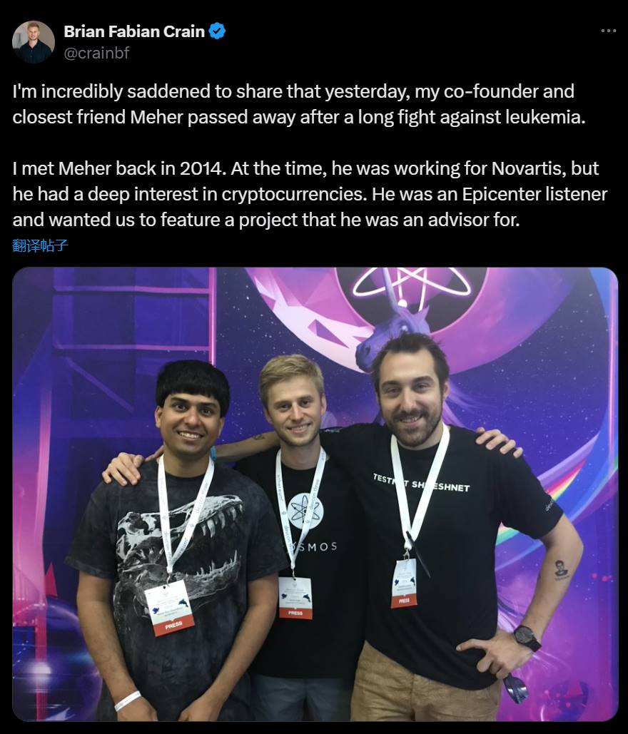 深潮 TechFLOW 消息,6 月 24 日,Chorus One 首席執行官 Brian Fabian Crain 在 X 平台披露,該項目聯合創始人Meher Roy在與白血病長期抗爭後已離世。