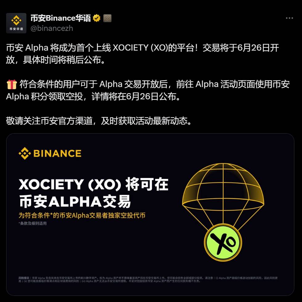 幣安 Alpha 將於6月26日上線 XOCIETY (XO),符合條件的用戶可申領空投