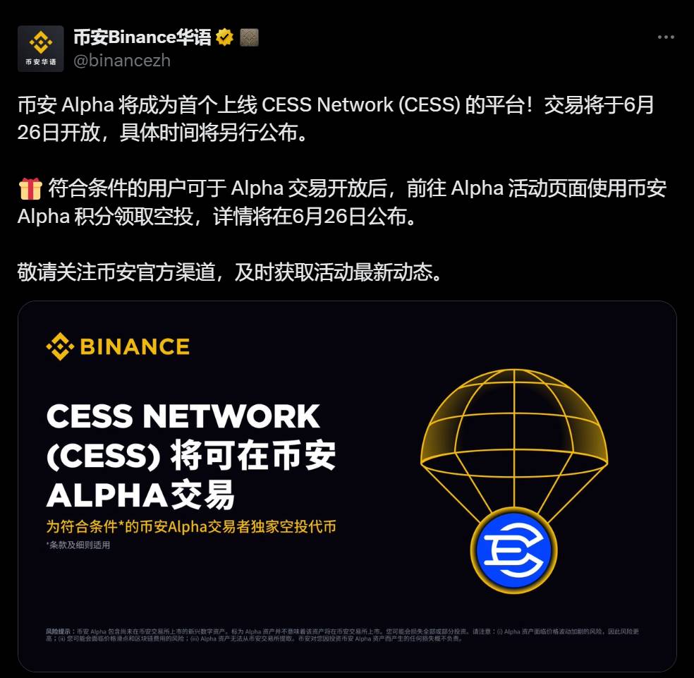 幣安 Alpha 將於6月26日上線 CESS Network (CESS),符合條件的用戶可申領空投