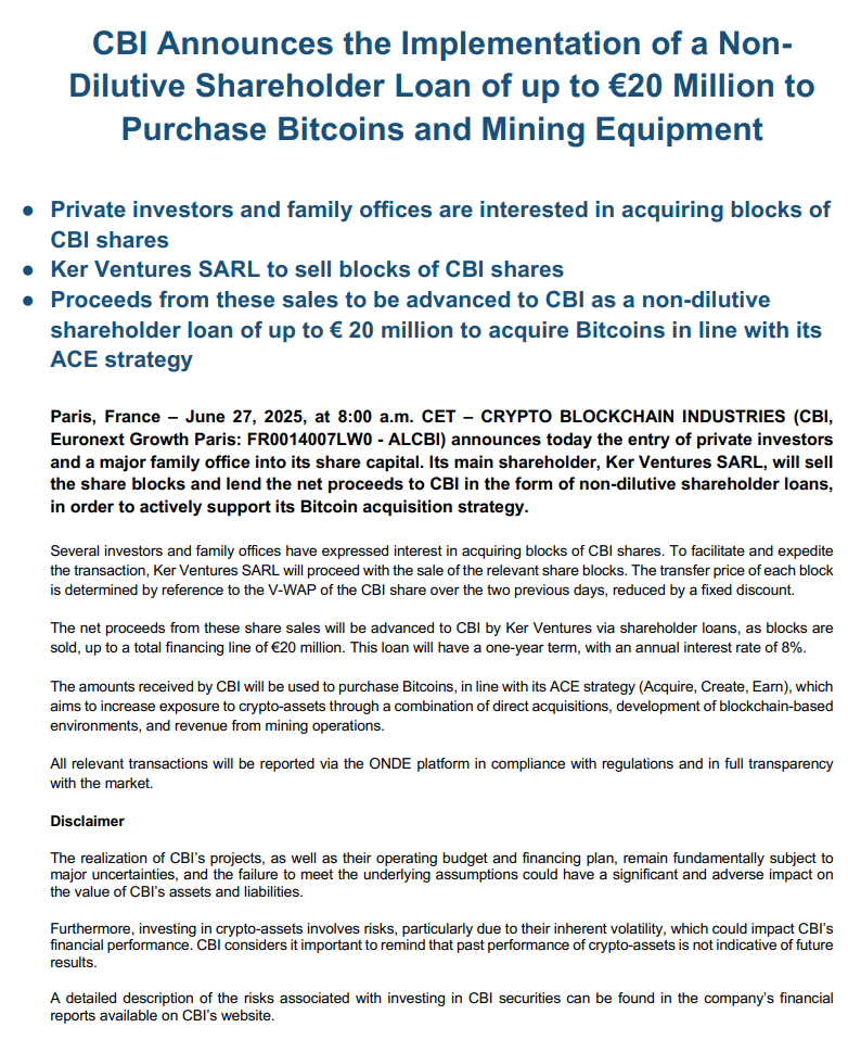 深潮 TechFlow 消息,6 月 27 日,據官方公告,法國上市加密區塊鏈產業公司 CRYPTO BLOCKCHAIN INDUSTRIES(CBI)宣布實施最高 2000 萬歐元的非稀釋性股東貸款,用於購買比特幣和挖礦設備。