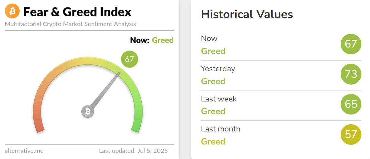 深潮 TechFlow 消息,7 月 5 日,據 Alternative.me 數據,今日加密貨幣恐慌與貪婪指數降至 67(昨日該指數為 73),表明市場仍處於「貪婪狀態」。