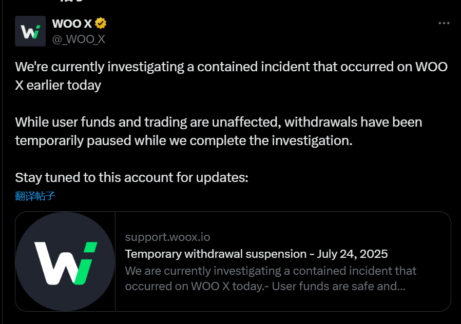 WOO 團隊已確認該事件,並表示:“我們正在調查今天稍早發生在 WOO X 平台上的一起受限事件。”目前用戶資金和交易未受影響,但在調查期間,平台已暫時暫停提款。