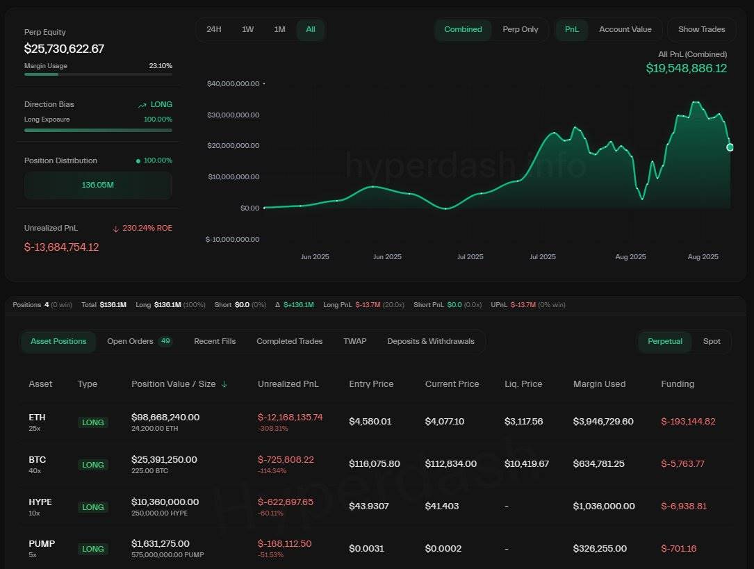 其當前持倉包括以太坊(25 倍槓桿)、比特幣(40 倍槓桿)、HYPE(10 倍槓桿)及 PUMP(5 倍槓桿)等多個多頭倉位。