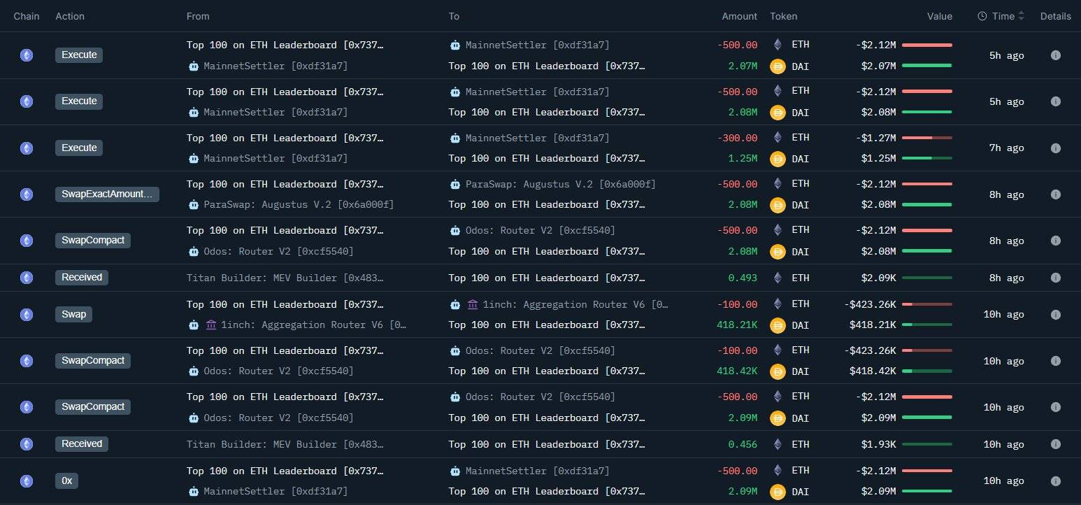 深潮 TechFlow 消息,8 月 20 日,據鏈上分析師 Onchain Lens(@OnchainLens)監測,某鯨魚地址在過去一天內再次拋售 8,500 枚以太坊,獲得約 3,815 萬美元 DAI。