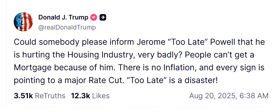 深潮 TechFLOW 消息,8 月 20 日,特朗普今晨在社交媒體上稱:“誰能告訴‘太遲先生’杰羅姆·鮑威爾,他正在嚴重傷害房地產行業?因為他,人們無法獲得抵押貸款。沒有通脹,所有跡像都表明將大幅降息。‘太遲先生’是個災難!”