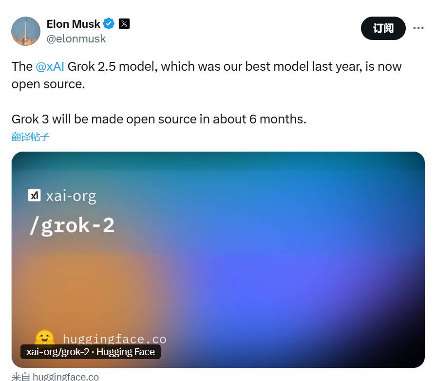 馬斯克宣布已開源 Grok 2.5模型,Grok 3 將在約 6 個月後開源