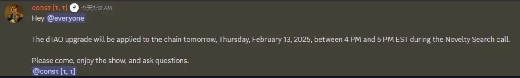 深潮TechFlow 消息,2 月13 日,據Bittensor Discord 公告,其Dynamic TAO(dTAO)升級將於北京時間2 月13 日17:00 至18:00(EST 4:00-5:00) 上線。