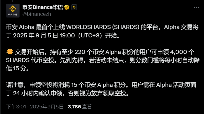 幣安 Alpha:WORLDSHARDS (SHARDS) 空投申領門檻為 220 Alpha 積分